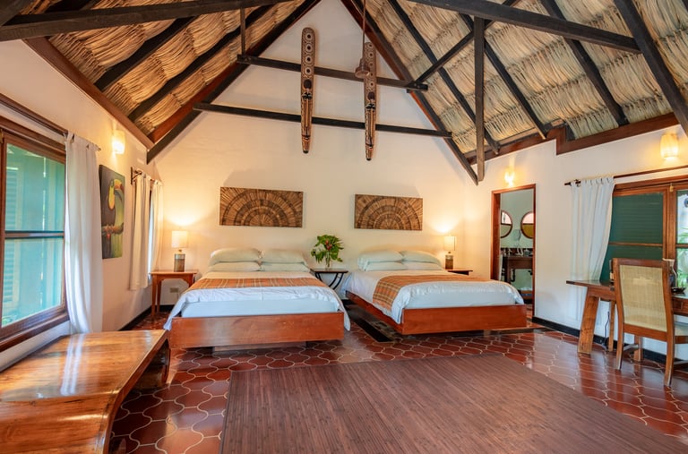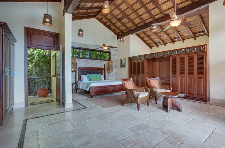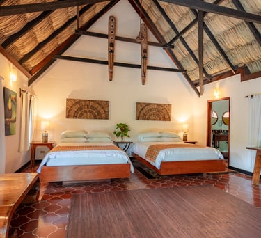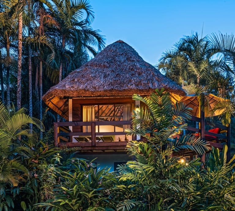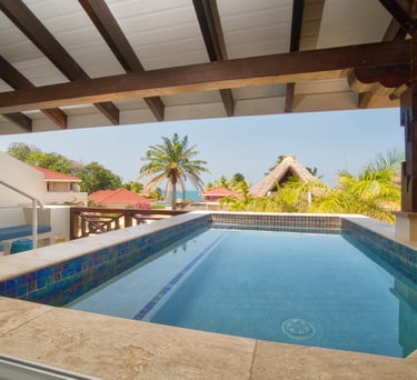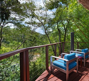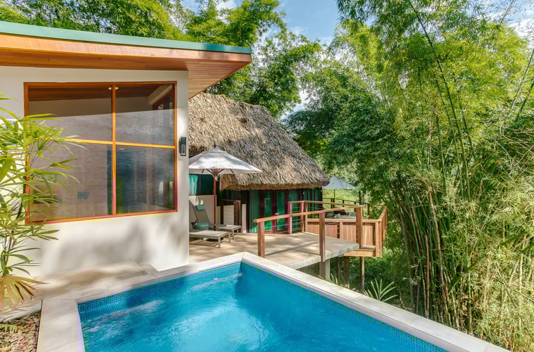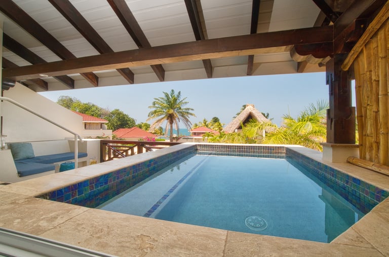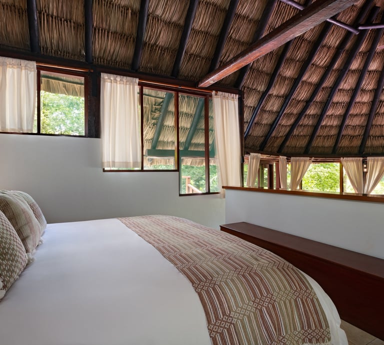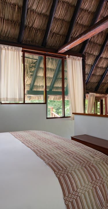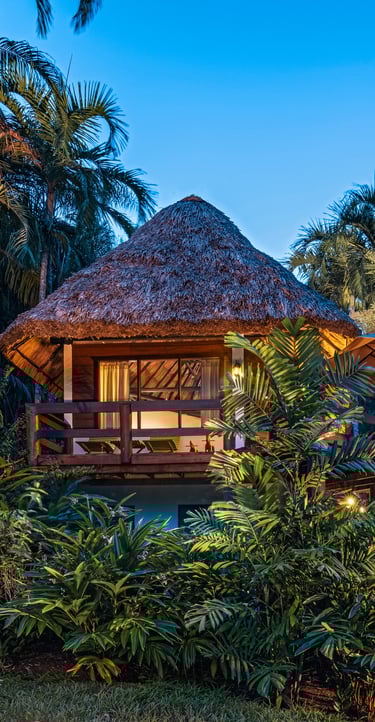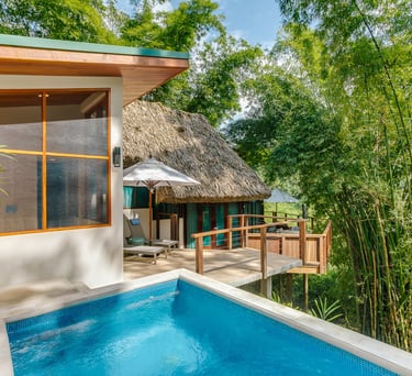 Averaging 1,235 sq. ft and boasting a large outdoor patio area with your very own private plunge pool, this unit creates a sense of grandeur while maintaining a relaxed ambiance throughout. Stunning and uninterrupted views over the Sibun River Reserve and a feeling of seclusion from the outside world. This penthouse suite reflects the true essence of the rainforest, having local mahogany wood, and furnished with a canopy king bed, a spacious bathroom, and an outdoor area perfect for appreciating those emotive Belizean sunsets.